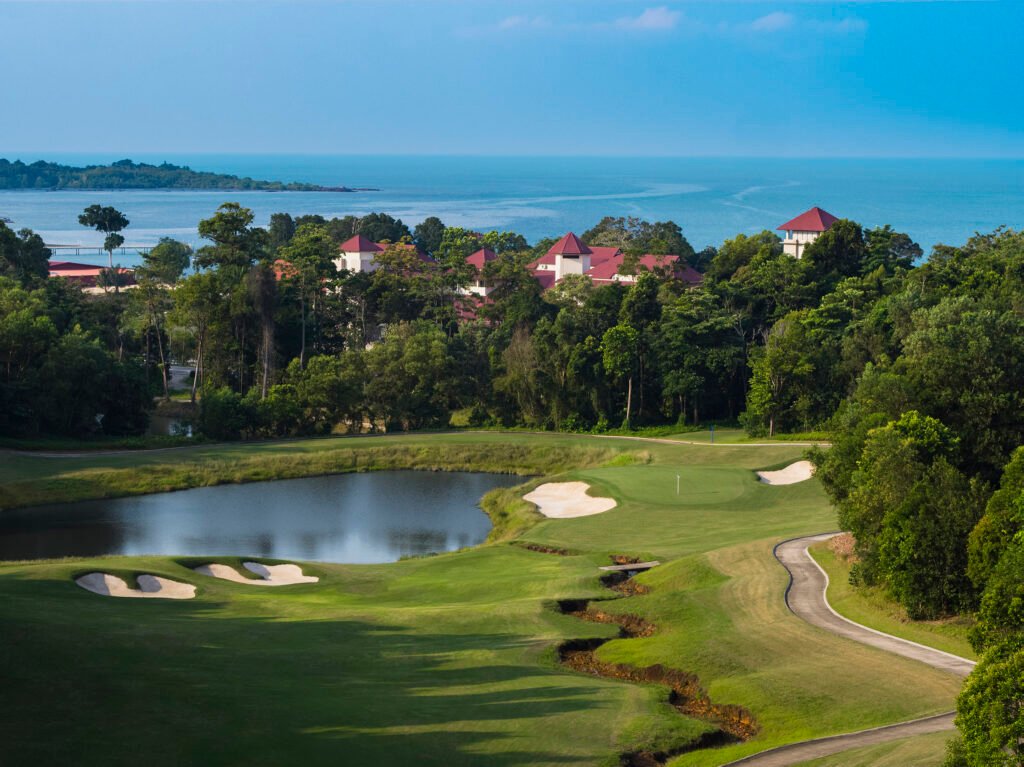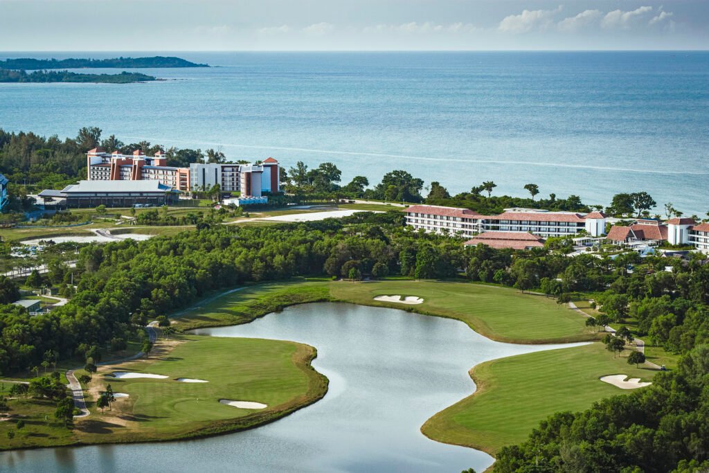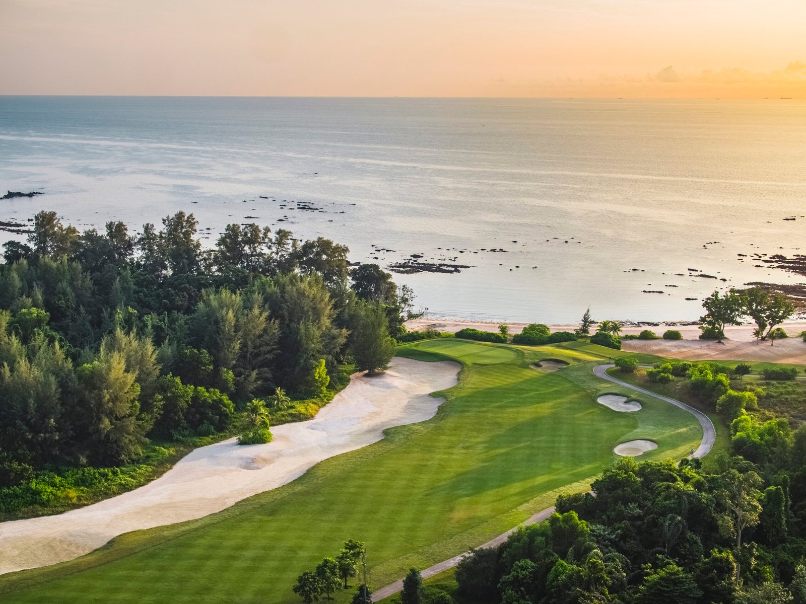 The Els Club Ocean Course in Desaru, Malaysia, designed by Ernie Els, offers a links-style championship experience with stunning South China Sea views, featuring three distinct loops (Coast, Ridgre, Lakes) for 27 holes, known for wide fairways, challenging greens, strategic bunkering, firm run-offs, and a memorable elevated par-3 signature hole with ocean backdrop.